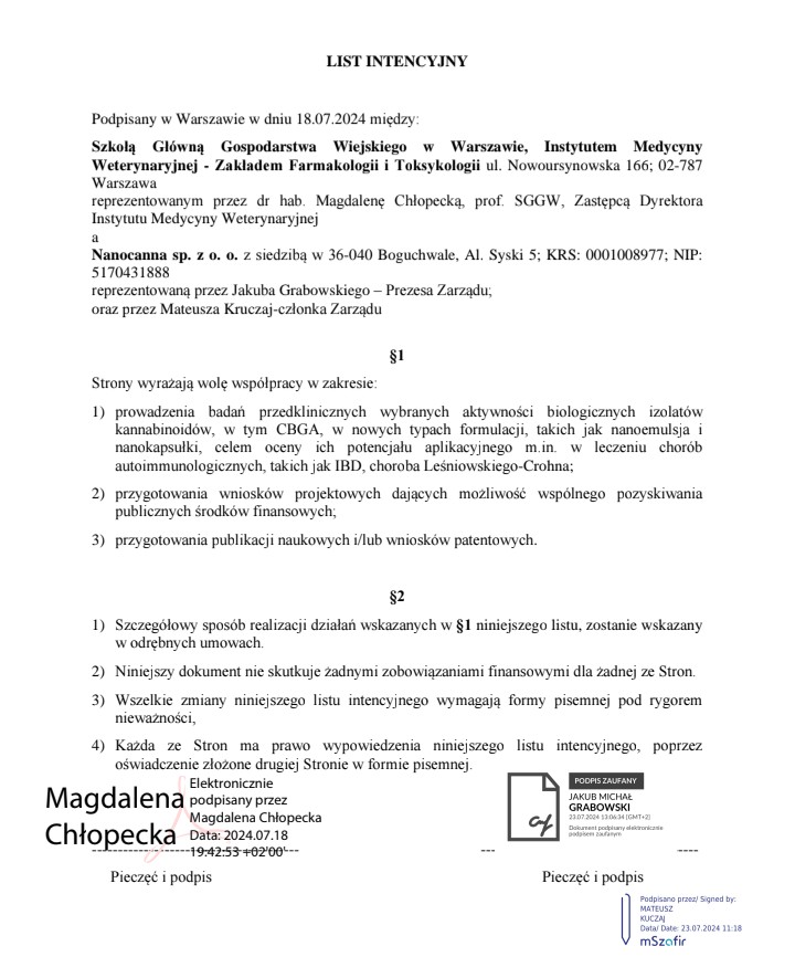 Z radością informujemy, że Nanocanna sp. z o.o. podpisała list intencyjny o współpracy z Instytutem Medycyny Weterynaryjnej Szkoły Głównej Gospodarstwa Wiejskiego w Warszawie.Wspólne działania będą koncentrować się na badaniach nad nowoczesnymi formulacjami kannabinoidów, opracowywaniu projektów naukowych oraz przygotowaniu publikacji.